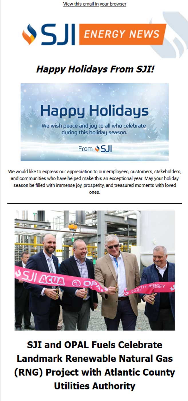 Sign up for SJI’s quarterly Newsletter for the latest on our clean energy advancements, community initiatives, and key findings related to the energy industry. Click here to sign up.